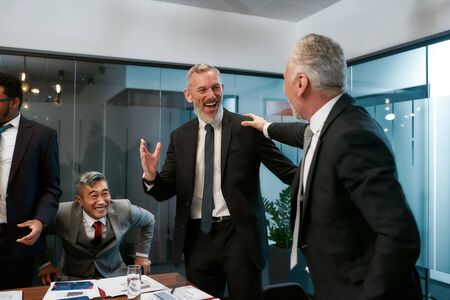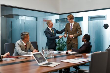 Successful project. Confident mature businessman in formal wear giving money to young happy man while having a meeting with multicultural team in the modern office