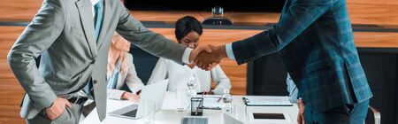 cropped view of two businessmen shaking hands near multicultural colleagues sitting in conference hall