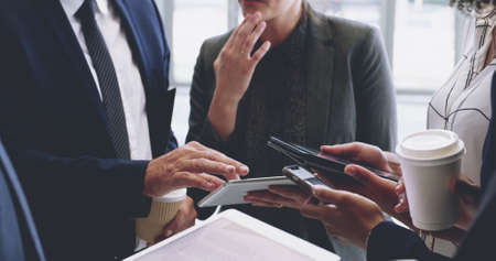 Businessmen and business women are meeting and using a tablet.