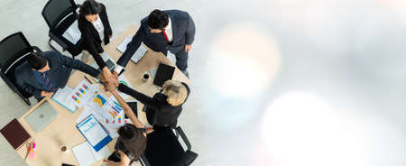 Group business people handshake at meeting table in office together with confident shot from top view . Young businessman and businesswoman workers express agreement of investment deal. broaden view