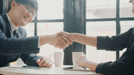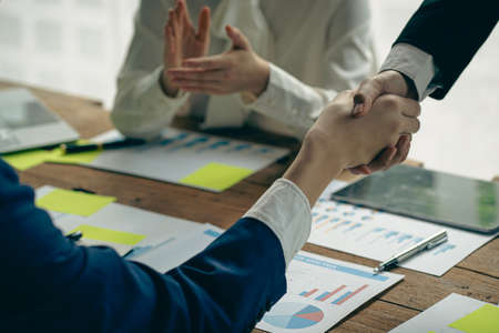 Business people shaking hands while sitting at the working place, Finish success business good deals meeting partnership