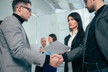 The job interviewer and the job applicant are holding hands after the job interview is finished. The concept of recruiting employees to work in the company, vacant positions.