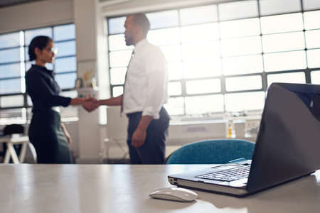 Technology brings people together. Shot of two businesspeople shaking hands in an office.
