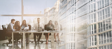 Double exposure of colleagues at business meeting and modern city. Concept of business consulting