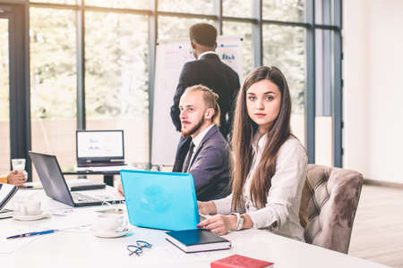 Young team works with documents and discuss the project in a stylish modern office. Work process in the office.