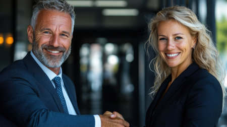 Two business professionals, a man and a woman, are shaking hands inside a contemporary office building. They appear engaged and friendly, representing a successful collaboration.