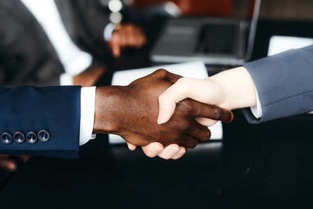 Confirmation of cooperation between the two companies. Interracial handshake