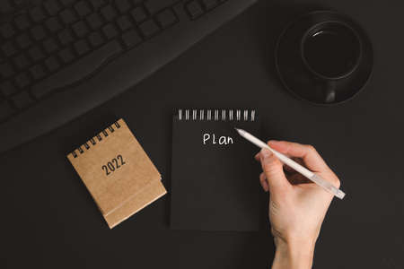 female hand writing down to-do list and plans for 2022 to notebook. Goals for next year