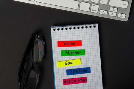 Vision - Mission - Goal - Strategy - Action plan - business process concept. Message at office workplace