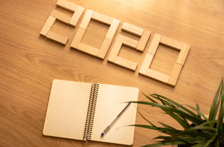 Abstract 2020 New year countdown design concept - wood blocks cubes on wooden NOTEBOOK
