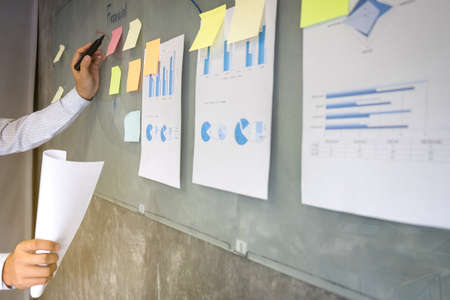 Two creative Business people meeting and planning use post it notes sticky note on board to share idea, Analysis data charts and graph with teamwork strategy brainstorming.