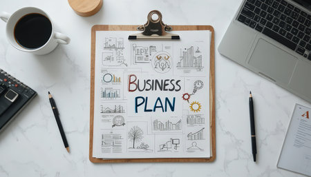 Business plan is organized on a clipboard alongside coffee, pens, and a laptop on a clean workspace.