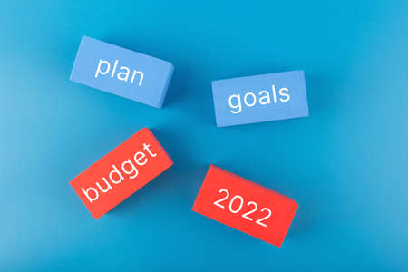 Business plan concept 2022. Text budget, plan, goals 2022 written on colored rectangles on dark blue background