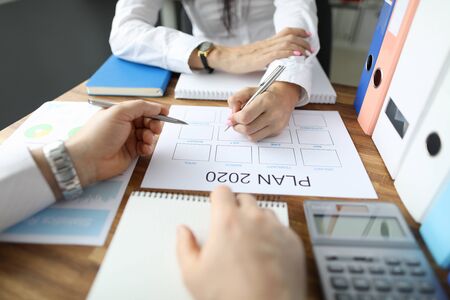 Top view of businesswoman and businessman creating businessplan for 2020 year. Folders and papers with diagrams on wooden desktop. Business and future planning concept