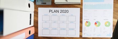 Top view on calendar for ideas and tasks for 2020. Table with documentation containing statistics. Calculator for business audit and accounting of profits and expenses of company