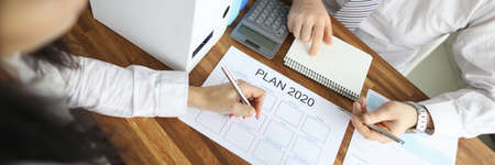 Focus on business plan calendar for 2020. Boss and employee at meeting thinking on targets and tasks. Man and woman in office. Calculator and documents at desk
