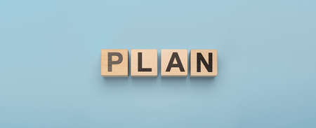Plan word on wooden cubes. Goals, success, strategy, solution . Business concept and web banner, header for plan