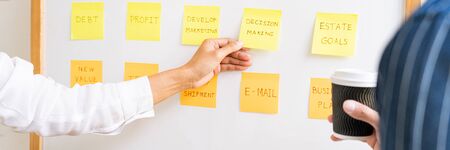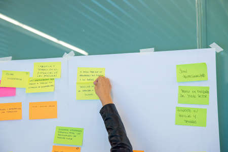 Business people arranging sticky notes commenting and brainstorming on work priorities colleague in a modern co-working space