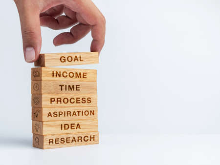 Words of business goals concepts collected in crossword with wooden cubes