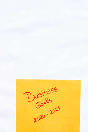 Business goals 2020-2021 handwriting text close up isolated on orange paper with copy space. Writing text on memo post reminder