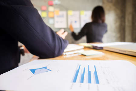 Close-up of graph, business man and secretary presentation report, two colleague excultive conference presentating chart report of new plan marketing to development consultating business in company.