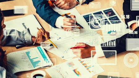 Creative visual of business people in corporate staff meeting . Concept of digital technology for marketing data analysis and investment decision making .