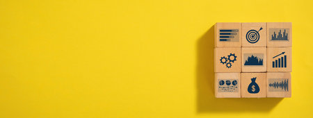Wooden block with business strategy and action plan symbols