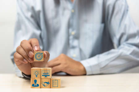 Businessman arranging wood block with target icon and business icon for strategy, action plan, growth business ,success process concept.