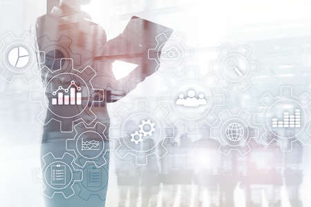 Business process automation concept. Gears and icons on abstract background