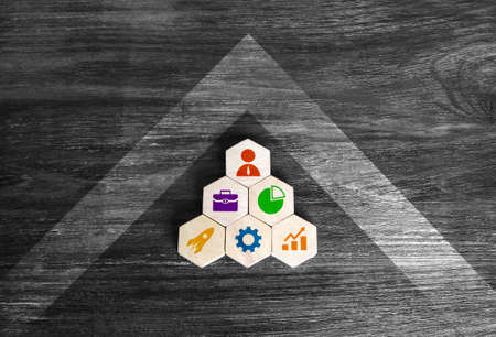 wooden cubes with the Growing Achievement icon Teamwork Management. Growing Business
