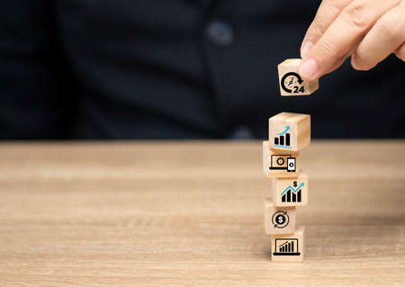 hand woods block cube with icon company strategy development, Concept success and business goals.
