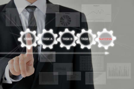 Business process management with workflow automation diagram and gears in virtual flowchart.businessman using digital tablet and laptop computer and document in modern office
