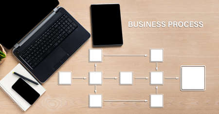 Laptop computer, tablet computer, and mobile phone blank screen on wood table background, with business process.