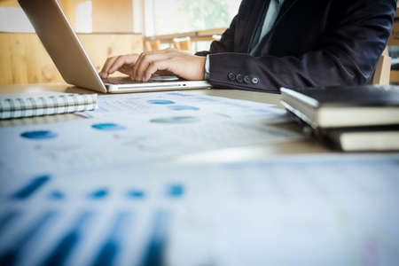 business man working with many document graph and laptop on his desk in morning light. business concept.