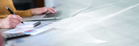 Businesswoman taking notes while using laptop; panoramic banner