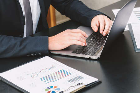 Businessman concept the male marketing accountant using the laptop to analyze the marketing and sales data for making the monthly report.