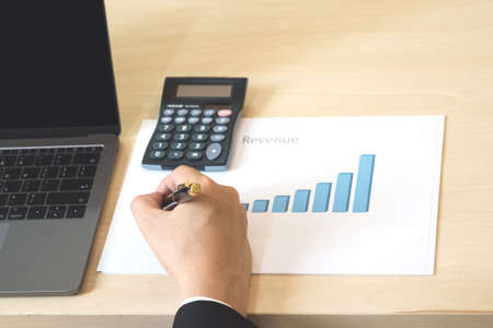 Success business man checking report profit on paper with rising charts, discussing company growth. Close up businessman hand holding pen and taking note in paper and laptop on wood desk in workplace.