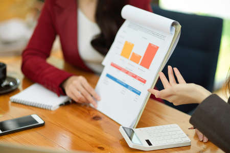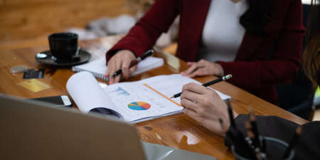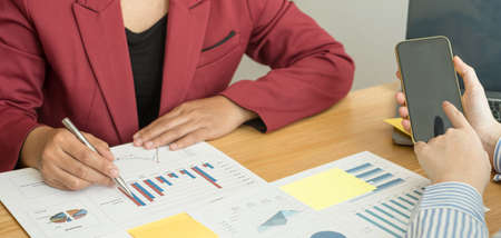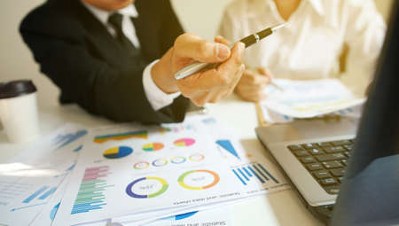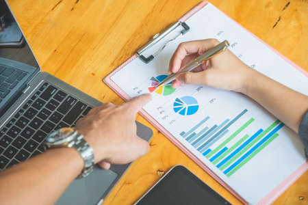 Business team is brainstorming with charts and analyzing or studying for investments.