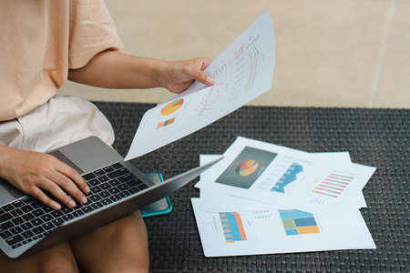 Asian business woman reviewing data in financial charts and graphs. Accounting concept