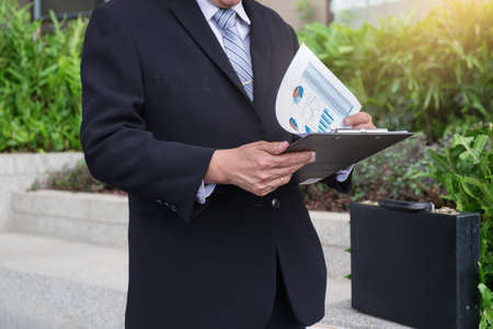 Attractive Confident businessman standing in a black suit and holding clipboard to analyze report of new financial project plan and checking account growing.