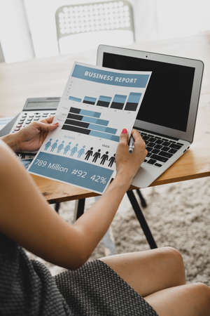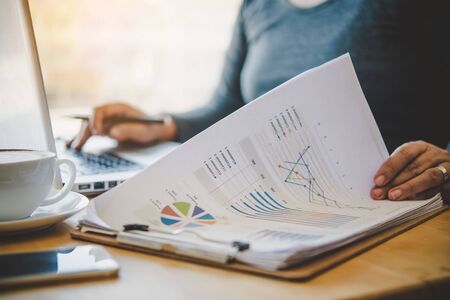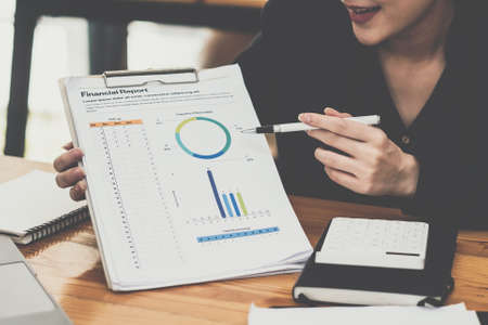 Business woman reviewing data in financial charts and graphs on wooden desk in office and business working, tax, accounting, statistics and analytic research concept