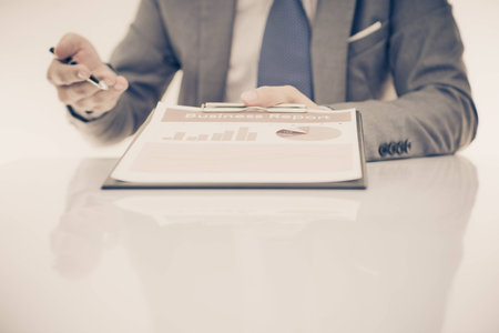 Cropped shot of businessman hand with pencil analysing on business paperwork on the table in office room