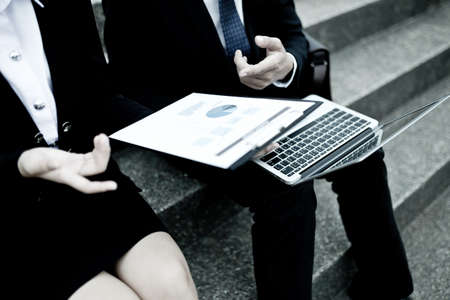 Close-up image of a Male financial analysts talking the financial work with a female manager in the office.