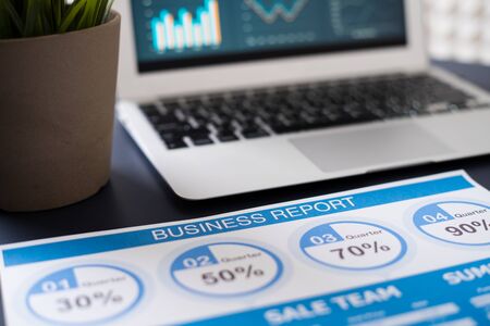 Laptop with graph chart report screen on work table. Home office or work space. Strategy analysis financial accounting concept