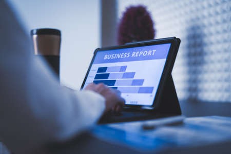 Businessman holds in his hands a tablet with reports. White background. No face visible. Business and finance concept