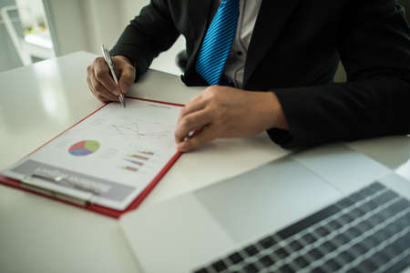 businessman holding pen to work computer graphs and charts data statistical data financial analysis documents.