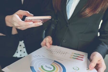 Asian female office worker typing on her laptop and working on business charts and mobile phone