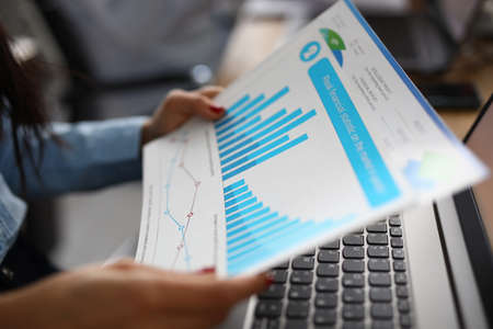Business woman hands analyze diagram graph show financial charts information in office table. Close up female executive explaining presenting marketing data on conference. Corporate analysis concept.