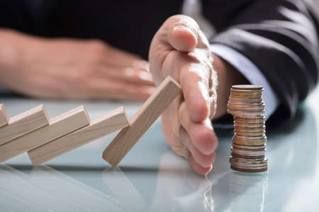 Close-up Of A Human Hand Stopping Wooden Blocks From Falling On Stacked Coins Over Desk