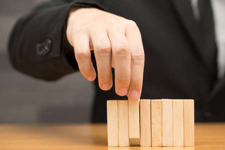 A close up of a business man carefully building a tower of wood blocks, strategy concept.